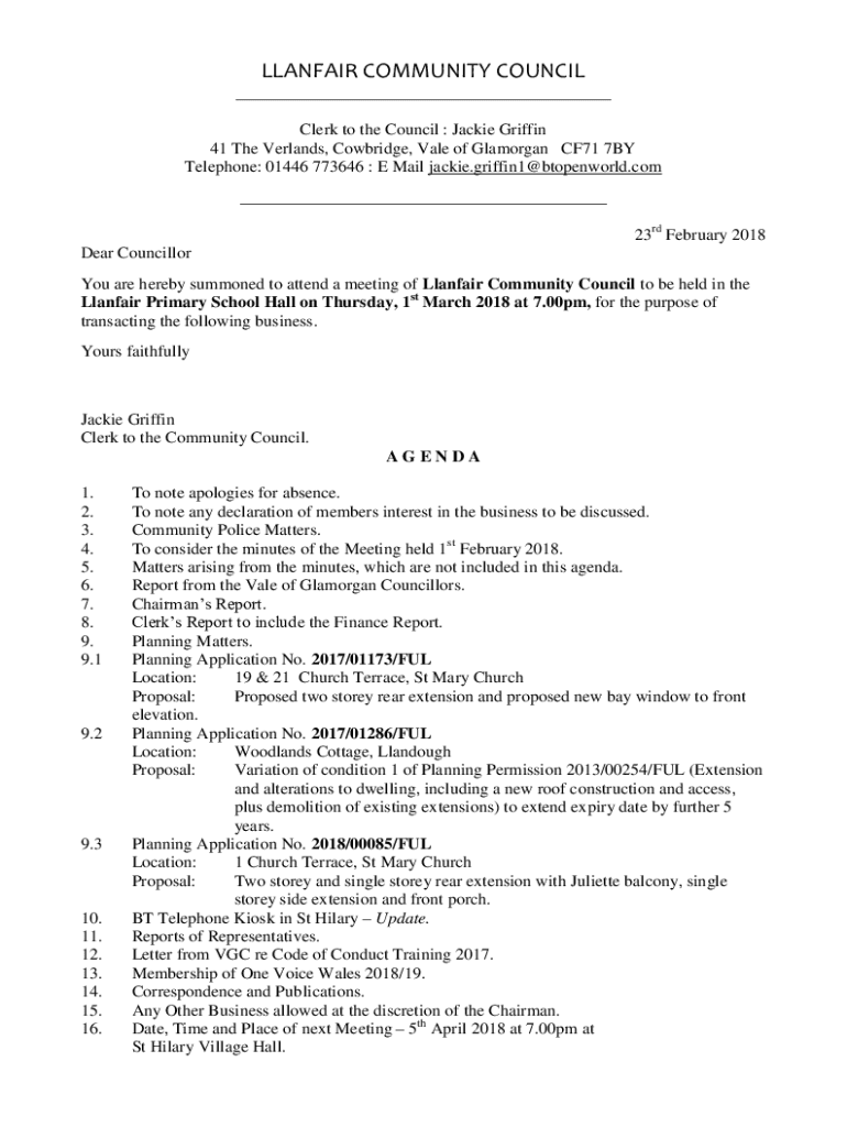AFFAIR COMMUNITY COUNCIL ___ Clerk to the Council : Jackie Griffin 41 The Wetlands, Cow bridge, Vale of Glamorgan CF71 7BY Telephone: 01446 773646 : E Mail jackie.griffin1@btopenworld.com ___ 23rd