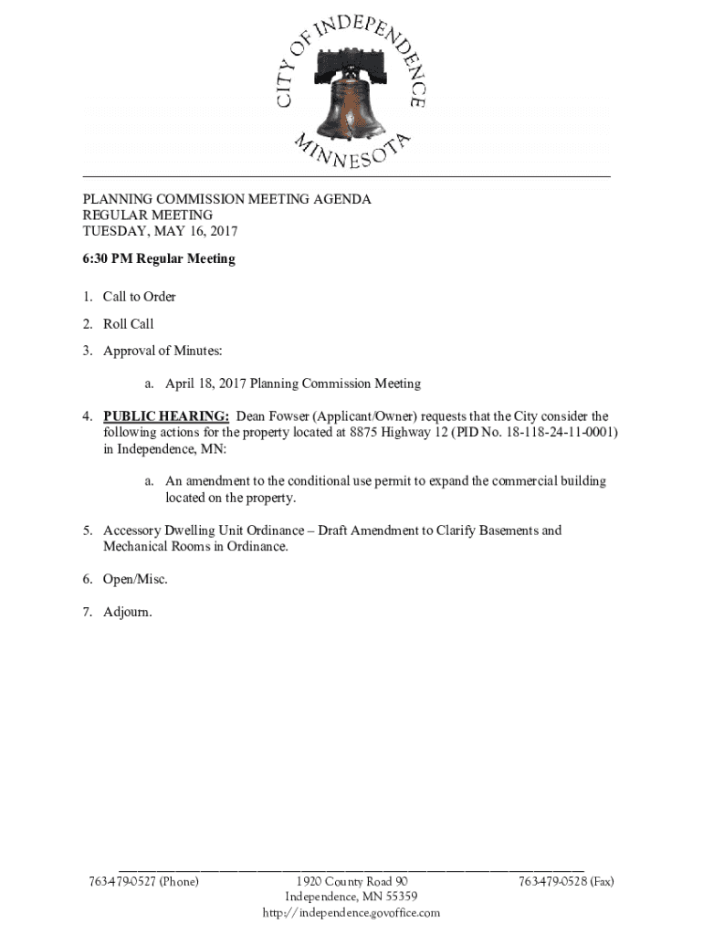 PLANNING COMMISSION MEETING AGENDA REGULAR MEETING TUESDAY, MAY 16, 20176:30 PM Regular Meeting 1. Call to Order 2. Roll Call 3. Approval of Minutes: a. April 18, 2017, Planning Commission Meeting
