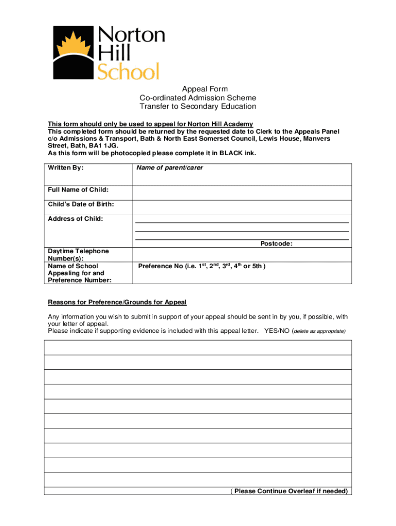 Appeal Form Coordinated Admission Scheme Transfer to Secondary Education This form should only be used to appeal for Norton Hill Academy This completed form should be returned by the requested date