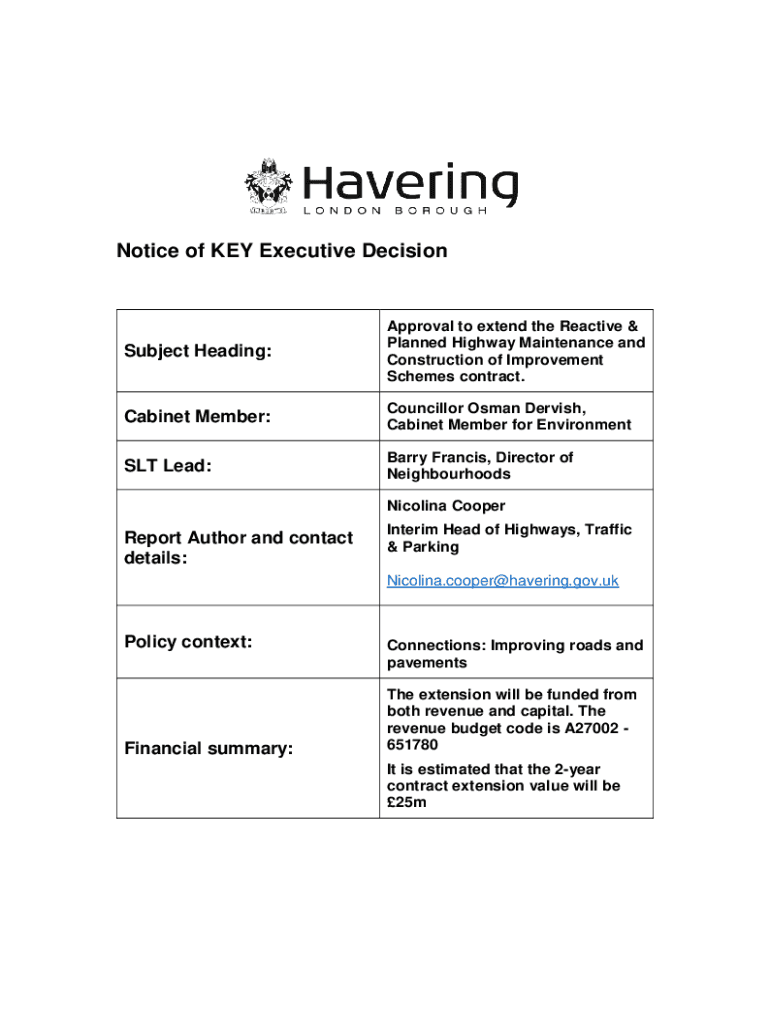Notice of KEY Executive DecisionSubject Heading:Approval to extend the Reactive & Planned Highway Maintenance and Construction of Improvement Schemes contract. Cabinet Member:Councillor Osman Dervish,