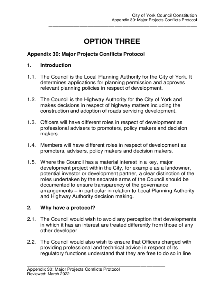 City of York Council Constitution Appendix 30: Major Projects Conflicts Protocol ___OPTION THREE Appendix 30: Major Projects Conflicts Protocol 1. Introduction1.1. The Council is the Local Planning