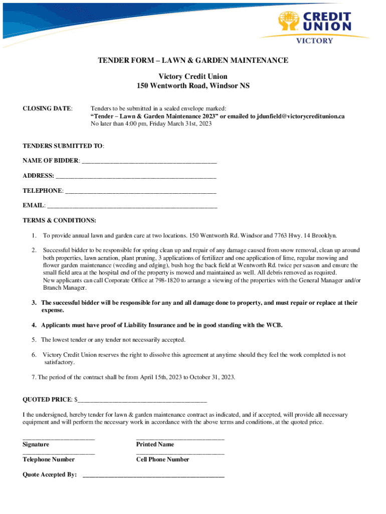 TENDER FORM LAWN & GARDEN MAINTENANCE Victory Credit Union 150 Wentworth Road, Windsor NS CLOSING DATE:Tenders to be submitted in a sealed envelope marked: Tender Lawn & Garden Maintenance 2023 or