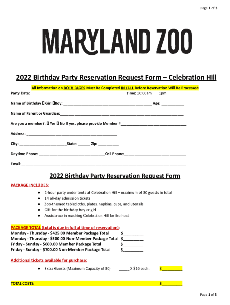 Page 1 of 32022 Birthday Party Reservation Request Form Celebration Hill All Information on BOTH PAGES Must Be Completed IN FULL Before Reservation Will Be Processed Party Date: ___ Time: 10:00am___