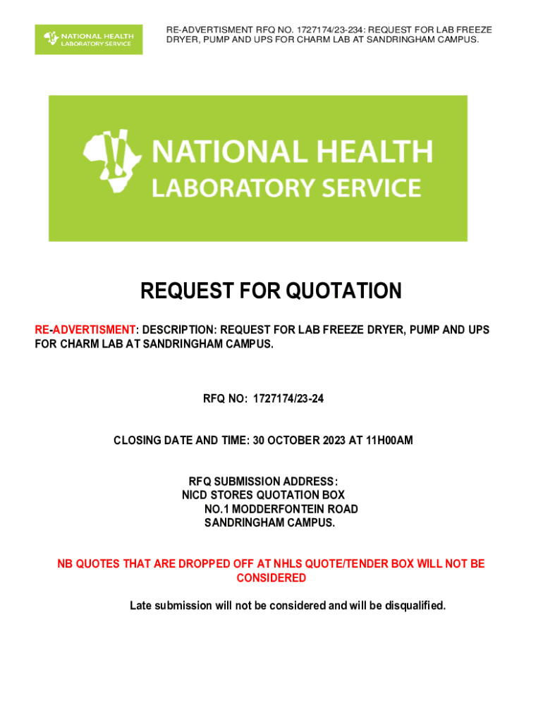 ADVERTISEMENT RFQ NO. 1727174/23234: REQUEST FOR LAB FREEZE DRYER, PUMP AND UPS FOR CHARM LAB AT SANDRINGHAM CAMPUS.REQUEST FOR QUOTATION ADVERTISEMENT: DESCRIPTION: REQUEST FOR LAB FREEZE DRYER,