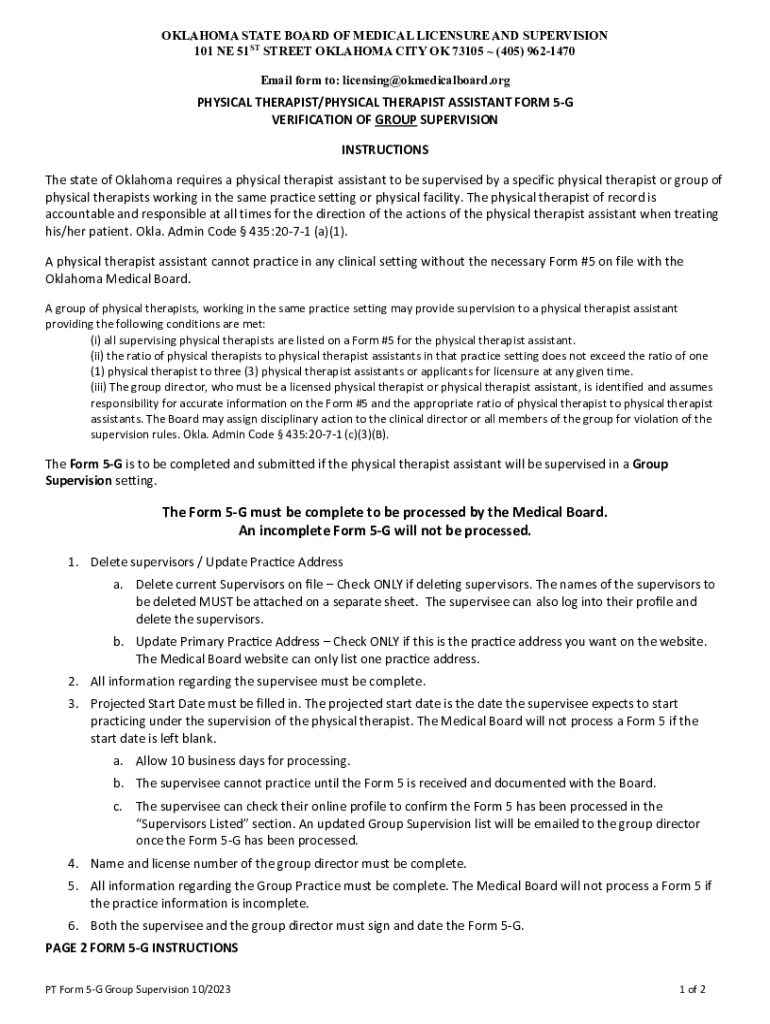OKLAHOMA STATE BOARD OF MEDICAL LICENSURE AND SUPERVISION 101 NE 51ST STREET OKLAHOMA CITY OK 73105 (405) 9621470 Email form to: licensing@okmedicalboard.orgPHYSICAL THERAPIST/PHYSICAL THERAPIST ASSISTANT