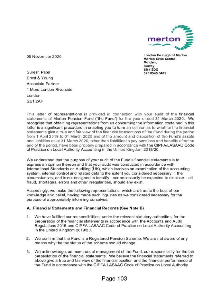 London Borough of Merton Civic Center Borden, Surrey SM4 5DX 020 8545 346105 November 2020Suresh Patel Ernst & Young Associate Partner 1 More London Riverside London SE1 2AFThis letter of representations