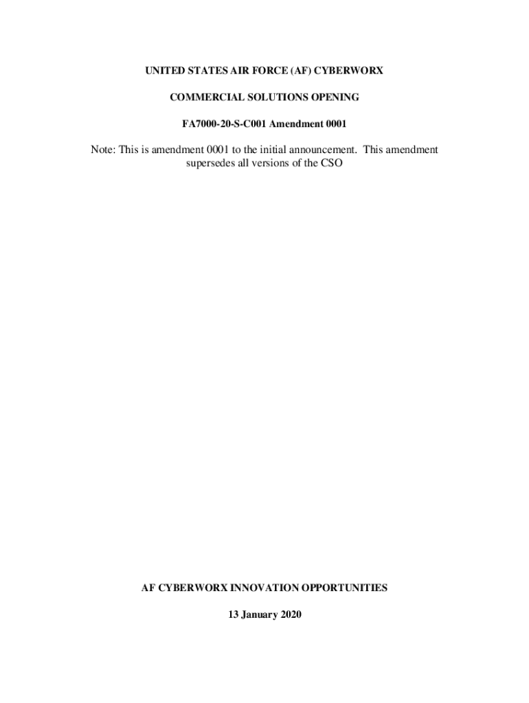 UNITED STATES AIR FORCE (AF) CYBERWAR COMMERCIAL SOLUTIONS OPENING FA700020SC001 Amendment 0001Note: This is amendment 0001 to the initial announcement. This amendment supersedes all versions of the