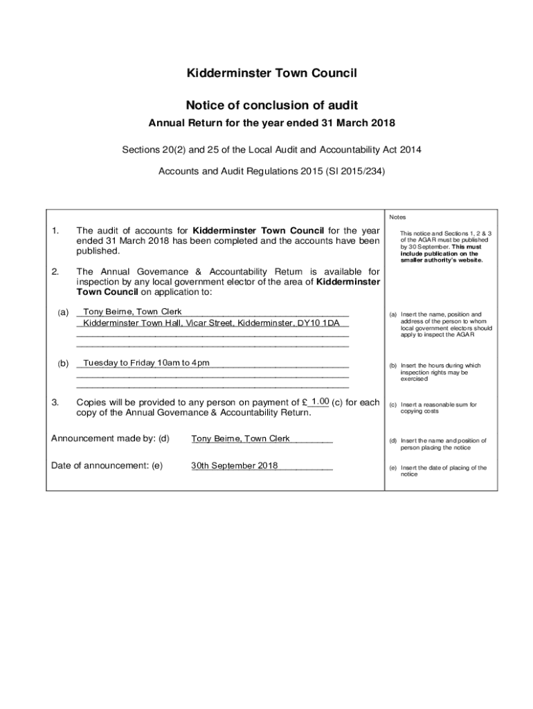 Kidder minster Town Council Notice of conclusion of audit Annual Return for the year ended 31 March 2018 Sections 20(2) and 25 of the Local Audit and Accountability Act 2014 Accounts and Audit Regulations