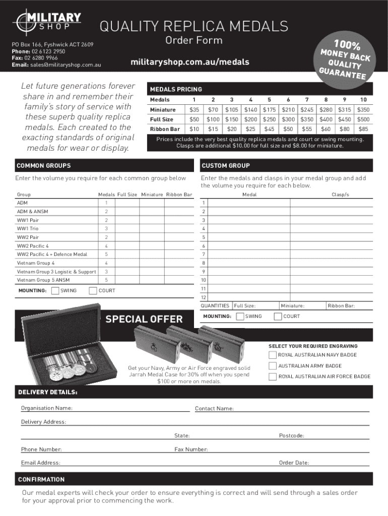 QUALITY REPLICA MEDALS Order Form PO Box 166, Shtick ACT 2609 Phone: 02 6123 2950 Fax: 02 6280 9966 Email: sales@militaryshop.com.au100%MONEY BAC QUALITY K GUARD Y NTEEmilitaryshop.com.au/medalsLet