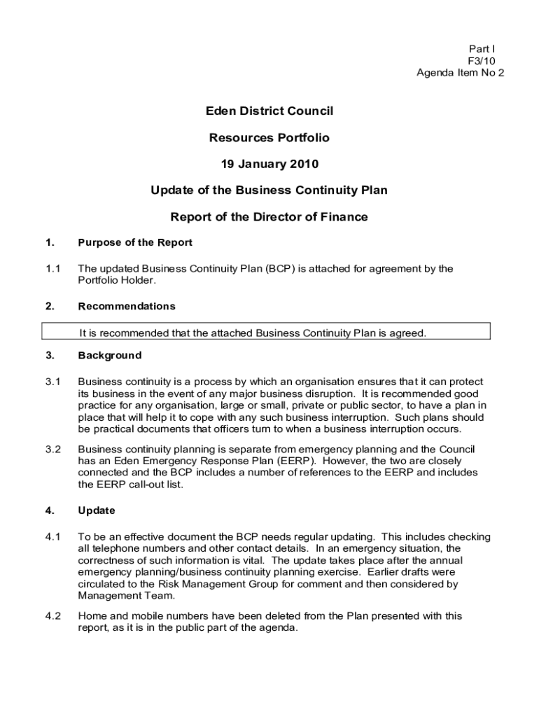 Part I F3/10 Agenda Item No 2Eden District Council Resources Portfolio 19 January 2010 Update of the Business Continuity Plan Report of the Director of Finance 1. Purpose of the Report1.1The updated