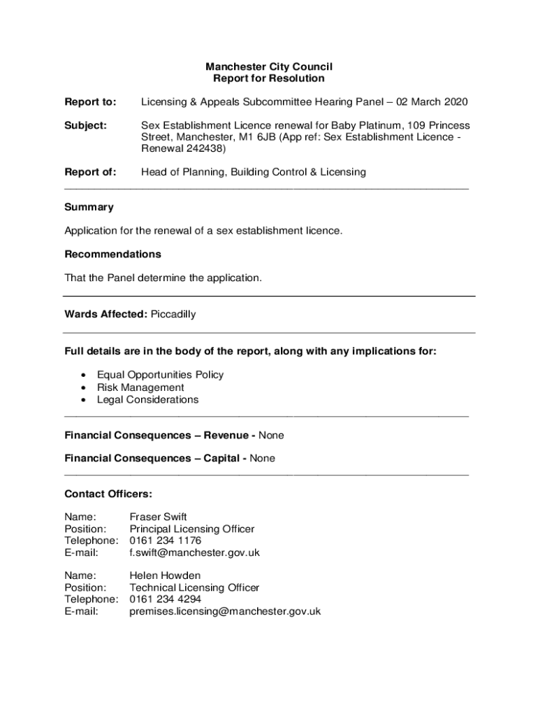 Manchester City Council Report for Resolution Report to:Licensing & Appeals Subcommittee Hearing Panel 02 March 2020Subject:Sex Establishment License renewal for Baby Platinum, 109 Princess Street,