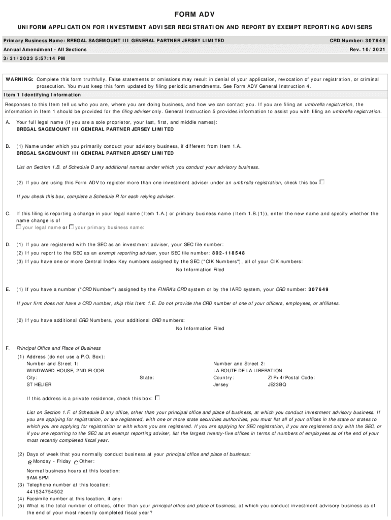 FORM ADV UNIFORM APPLICATION FOR INVESTMENT ADVISER REGISTRATION AND REPORT BY EXEMPT REPORTING ADVISERS Primary Business Name: REGAL AMOUNT III GENERAL PARTNER JERSEY LIMITED CRD Number: 307649Annual