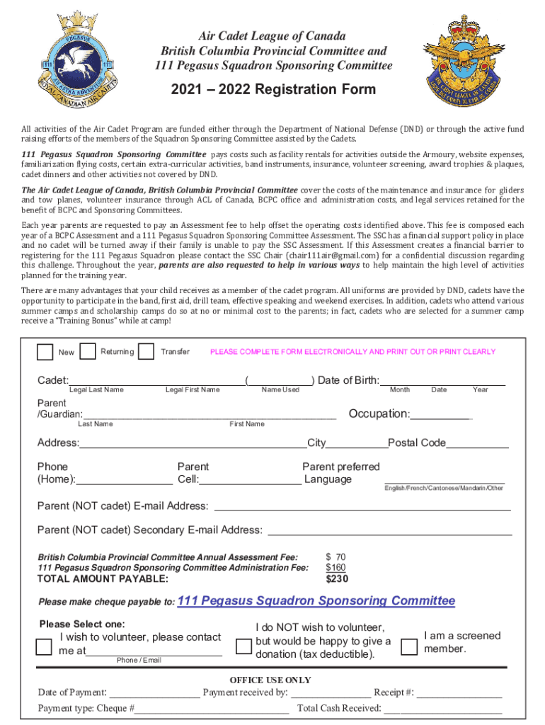 Air Cadet League of Canada British Columbia Provincial Committee and 111 Pegasus Squadron Sponsoring Committee2021 2022 Registration Form All activities of the Air Cadet Program are funded either