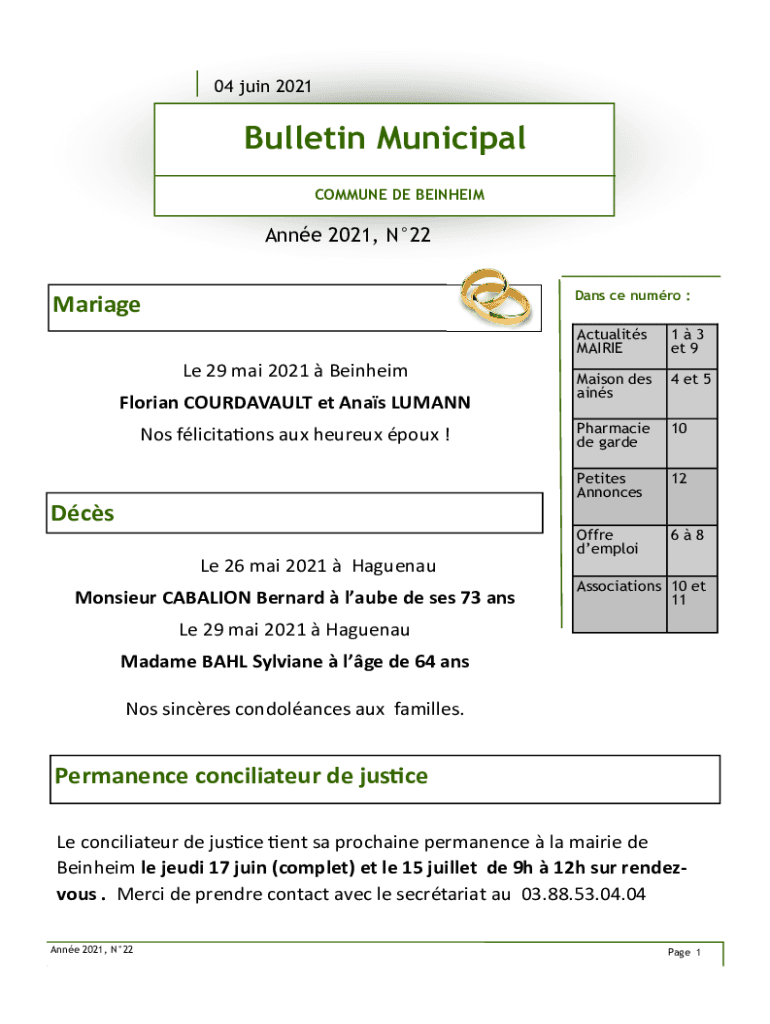 04 join 2021Bulletin Municipal COMMUNE DE BEINHEIMAnne 2021, N22 Dan's CE humor :Marriage Le 29 Mai 2021 Bantam Florian COURDAVAULT et Ana's LUANN Nos Alicia ONS aux here pour ! Actuality MAIRIE13