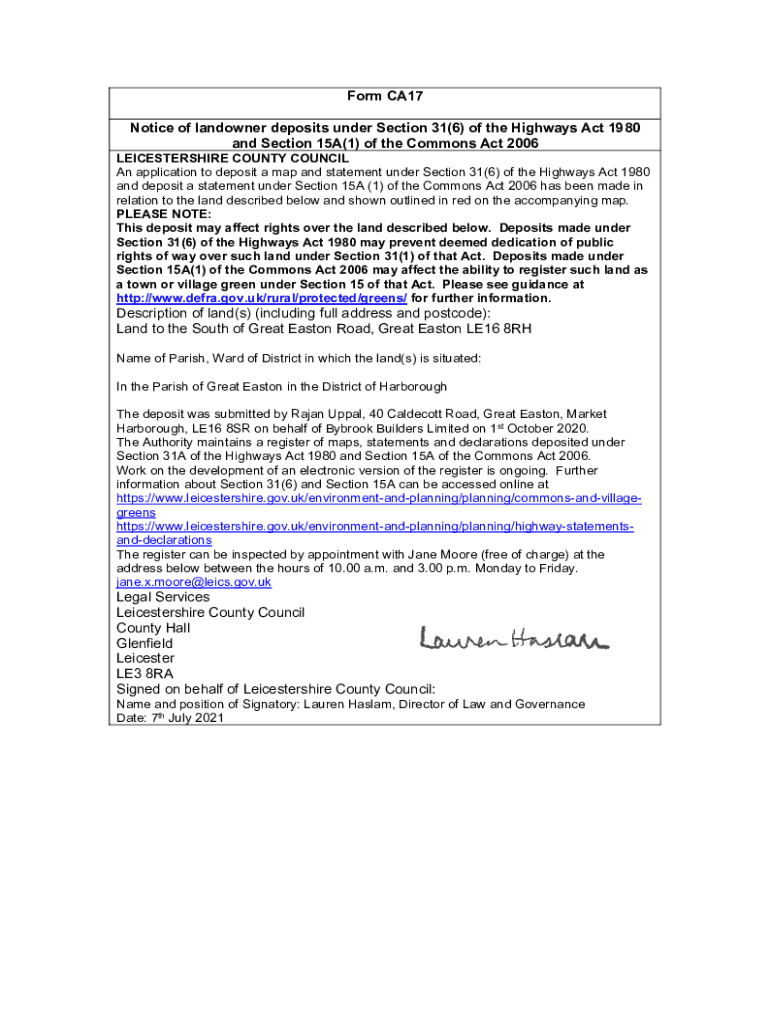 Form CA17 Notice of landowner deposits under Section 31(6) of the Highways Act 1980 and Section 15A(1) of the Commons Act 2006LEICESTERSHIRE COUNTY COUNCIL An application to deposit a map and statement