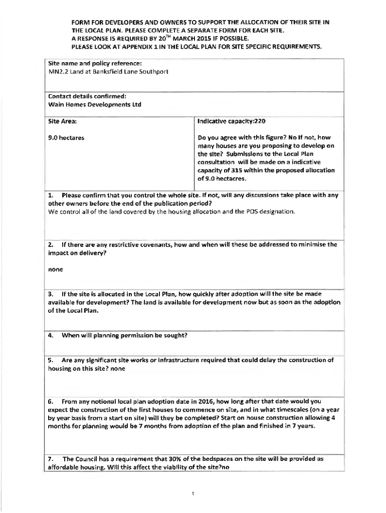123FORMFORDEVELOPERSANDOWNERSTOSUPPORTTHEALLOCATIONOFTHEIRSITEIN THELOCALPLAN.PLEASECOMPLETEASEPARATEFORMFOREACHSITE. ARESPONSEISREQUIREDBY20THMARCH2015IFPOSSIBLE. PLEASELOOKATAPPENDIX1INTHELOCALPLANFORSITESPECIFICREQUIREMENTS.
