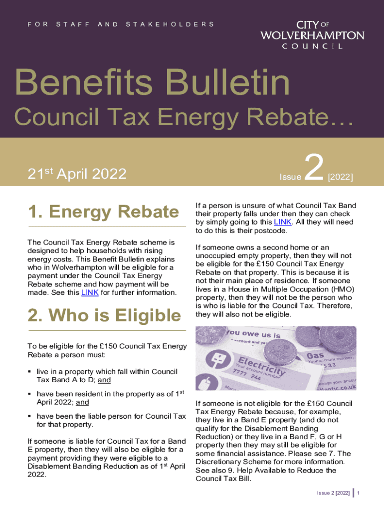 F O RS T A F FA N DS T A K E H O L D E RS Benefits Bulletin Council Tax Energy Rebate 21st April 20221. Energy Rebate The Council Tax Energy Rebate scheme is designed to help households with rising