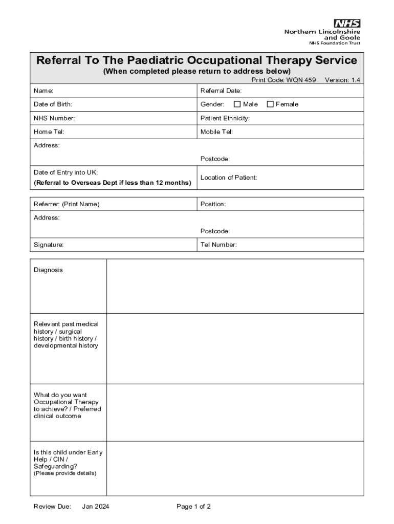Referral To The Pediatric Occupational Therapy Service (When completed please return to address below)Print Code: WON 459Name:Referral Date:Date of Birth:Gender:NHS Number:Patient Ethnicity:Home Tel:Mobile