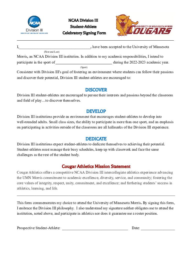 NCAA Division III StudentAthlete Celebratory Signing Form ___I, ___, have been accepted to the University of Minnesota (First and Last)Morris, an NCAA Division III institution. In addition to my academic