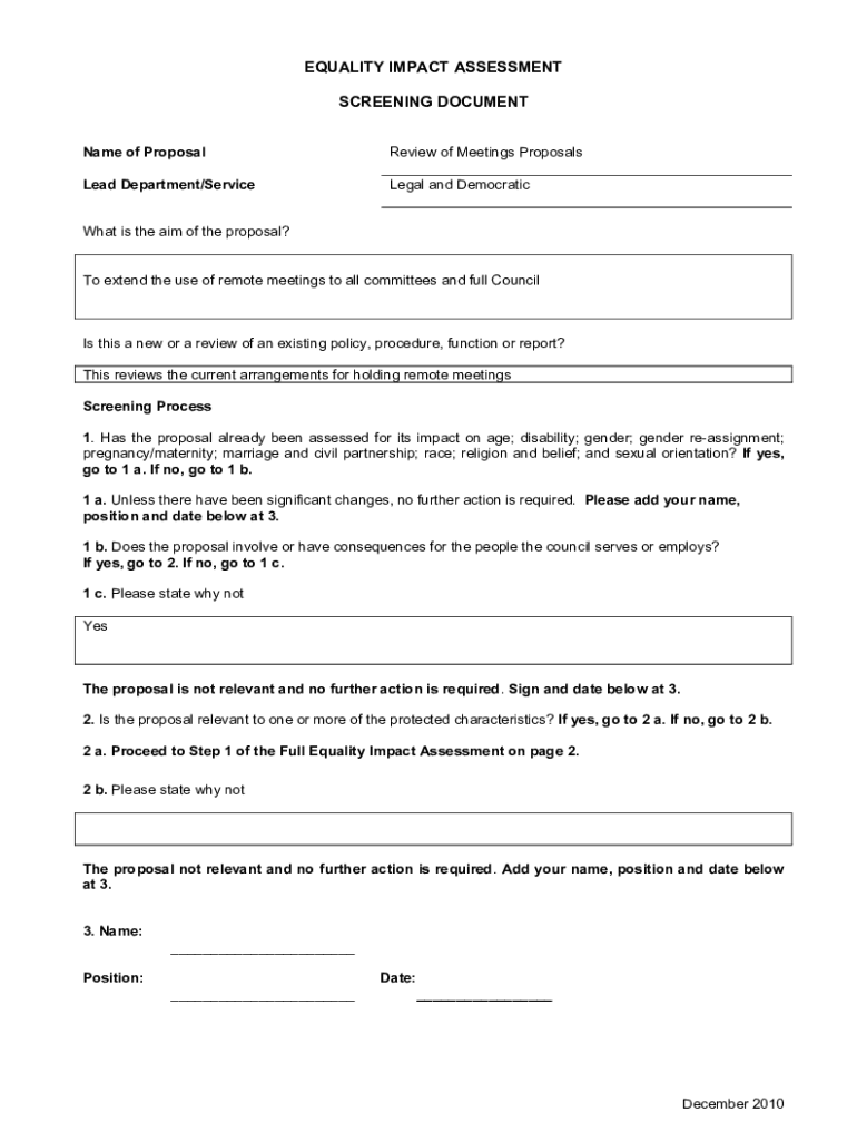 EQUALITY IMPACT ASSESSMENT SCREENING DOCUMENT Name of ProposalReview of Meetings ProposalsLead Department/ServiceLegal and DemocraticWhat is the aim of the proposal? To extend the use of remote meetings
