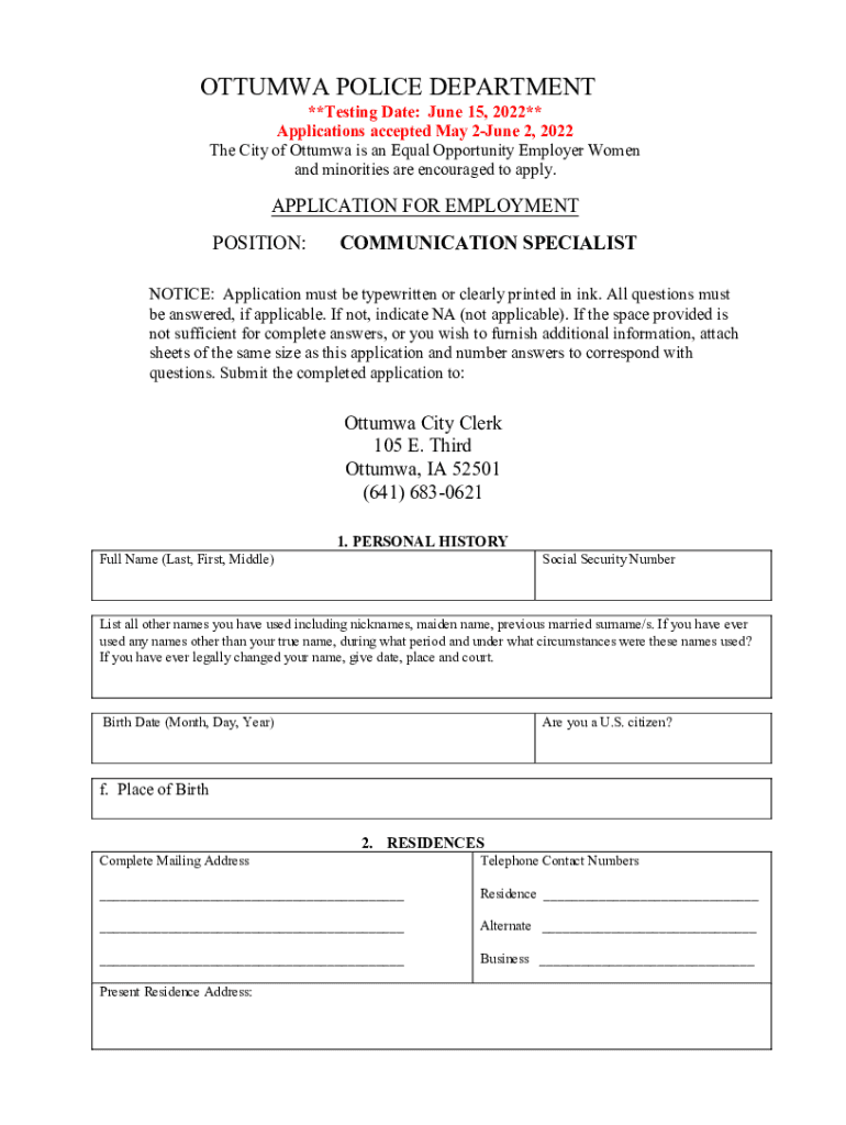OTTAWA POLICE DEPARTMENT**Testing Date: June 15, 2022** Applications accepted May 2June 2, 2022 The City of Ottawa is an Equal Opportunity Employer Women and minorities are encouraged to apply. APPLICATION