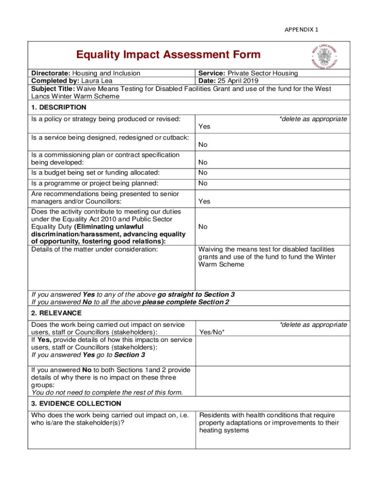 APPENDIX 1Equality Impact Assessment Form Directorate: Housing and Inclusion Service: Private Sector Housing Completed by: Laura Lea Date: 25 April 2019 Subject Title: Waive Means Testing for Disabled