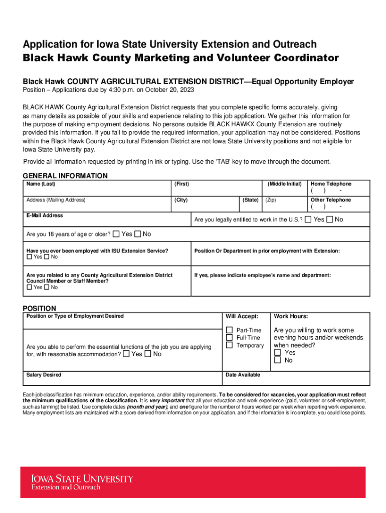 Application for Iowa State University Extension and Outreach Black Hawk County Marketing and Volunteer Coordinator Black Hawk County AGRICULTURAL EXTENSION DISTRICTEqual Opportunity Employer Position