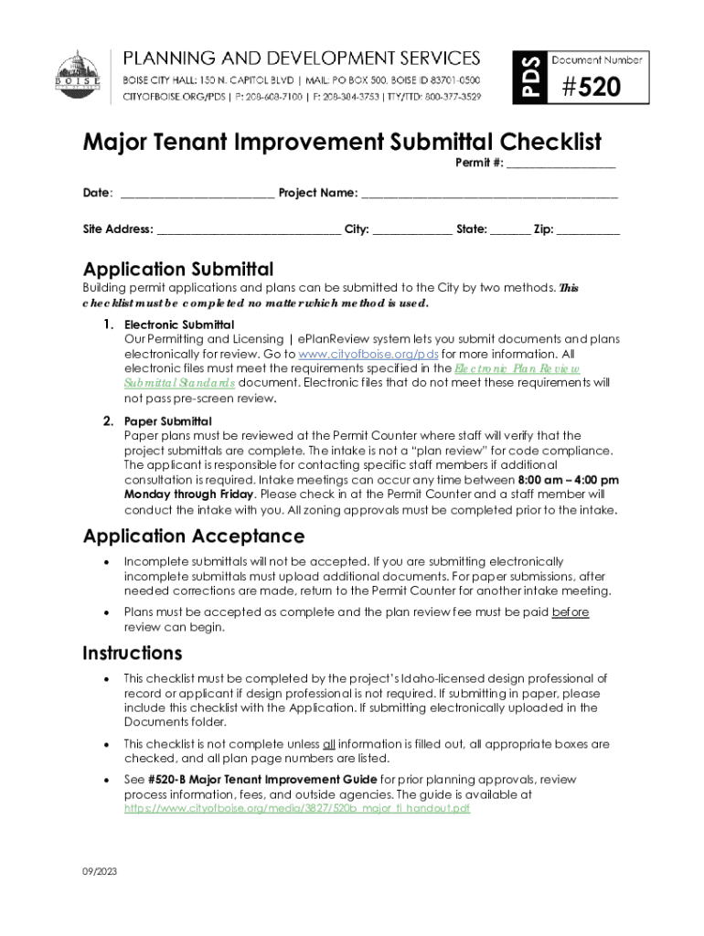 #520 Major Tenant Improvement Submittal ChecklistPermit #: ___Date: ___ Project Name: ___ Site Address: ___ City: ___ State: ___ Zip: ___Application SubmittalBuilding permit applications and plans