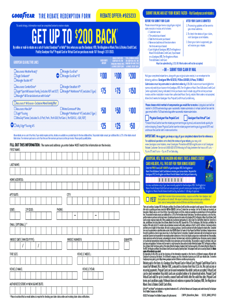 REBATE OFFER: #923233TIRE REBATE REDEMPTION FORM To avoid delays, information must be completed below to receive rebate. GET UP TO $200 Back online or mailing rebate on a set of 4 select Goodyear