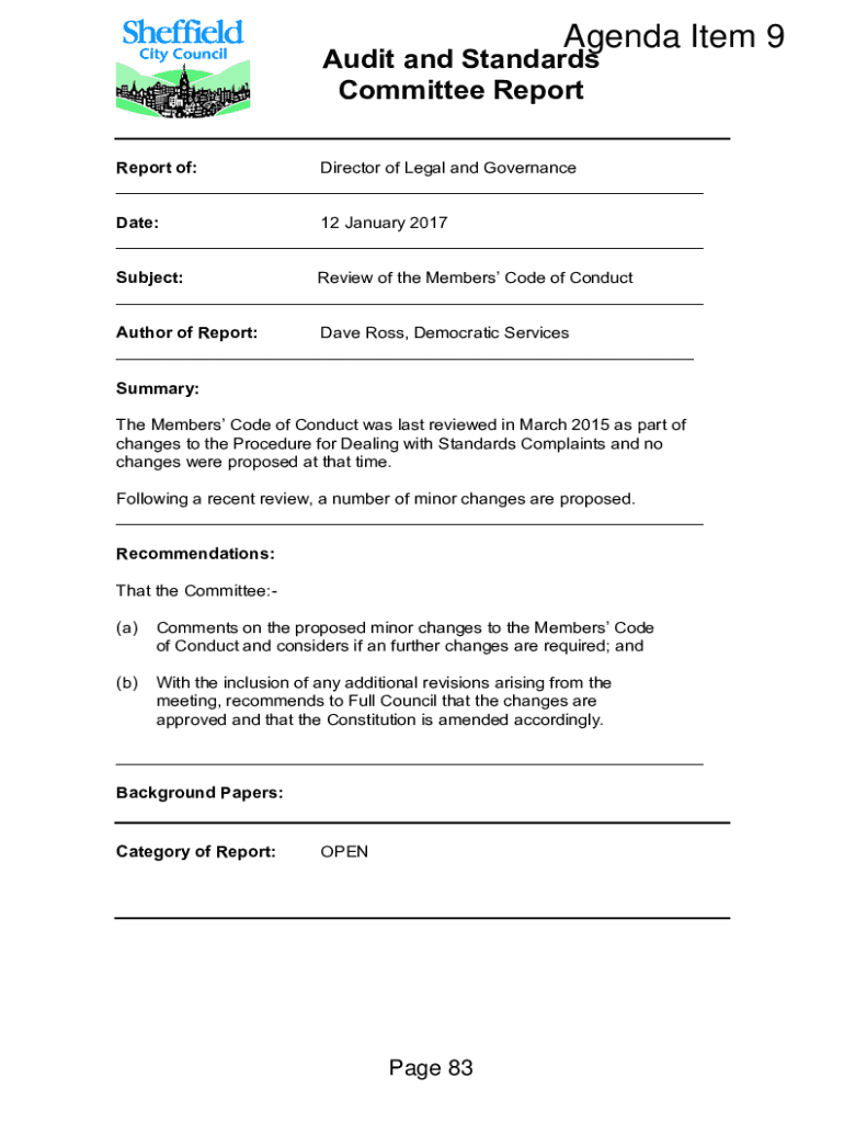 Agenda Item 9Audit and Standards Committee ReportReport of: Director of Legal and Governance ___ Date: 12 January 2017 ___ Subject: Review of the Members Code of Conduct ___ Author of Report: Dave