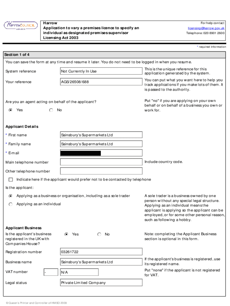 Harrow Application to vary a premises license to specify an individual as designated premises supervisor Licensing Act 2003For help contact licensing@harrow.gov.uk Telephone: 020 8901 2600* required