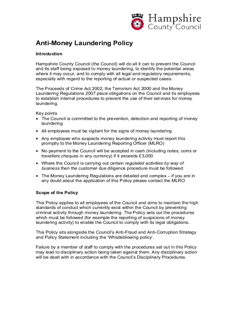 Antimony Laundering Policy Introduction Hampshire County Council (the Council) will do all it can to prevent the Council and its staff being exposed to money laundering, to identify the potential