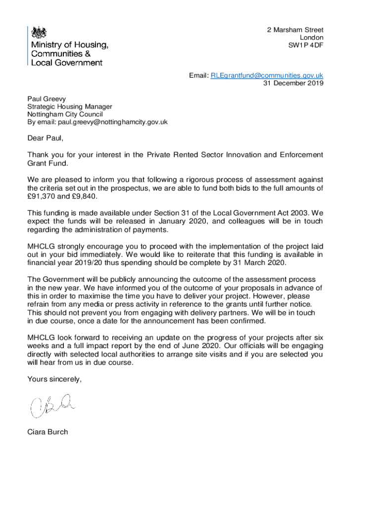 2 Marshal Street London SW1P 4DFEmail: RLEgrantfund@communities.gov.uk 31 December 2019 Paul Greedy Strategic Housing Manager Nottingham City Council By email: paul.greevy@nottinghamcity.gov.ukDear