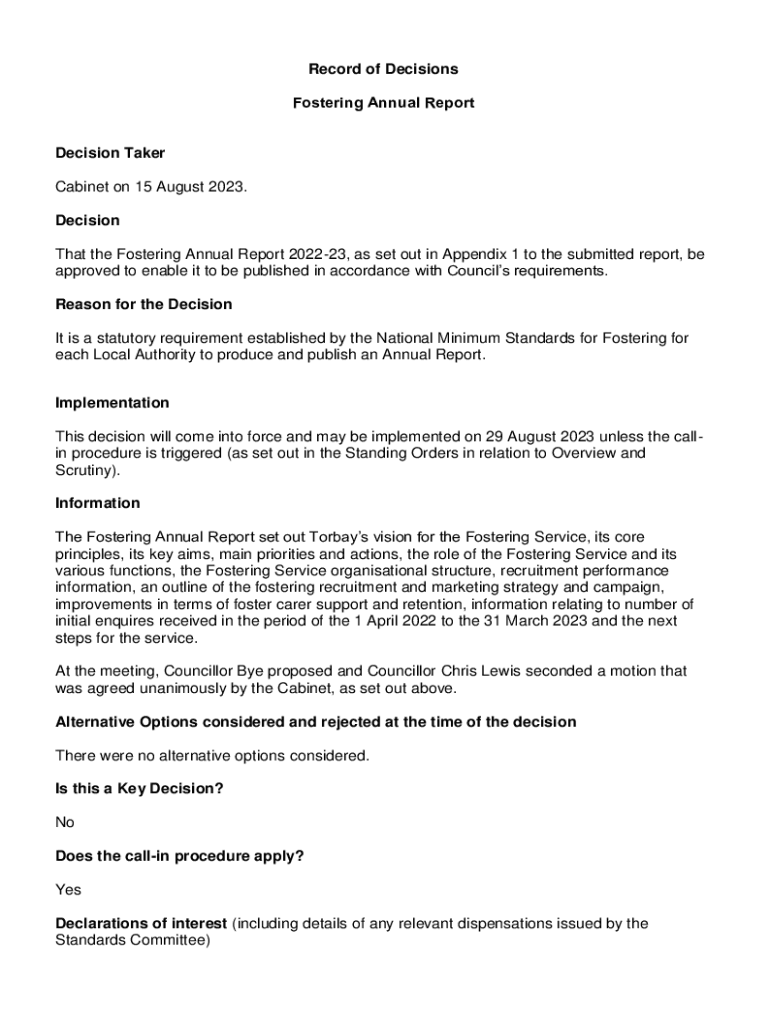 Record of Decisions Fostering Annual ReportDecision Taker Cabinet on 15 August 2023. Decision That the Fostering Annual Report 202223, as set out in Appendix 1 to the submitted report, be approved