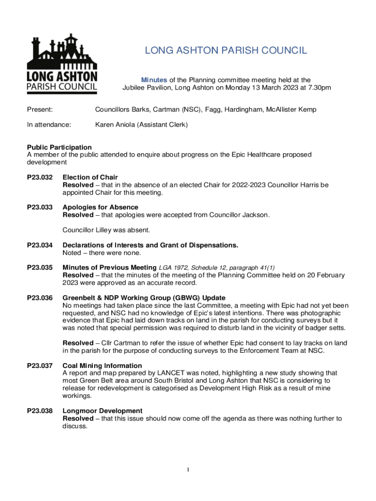 LONG ASHTON PARISH COUNCIL Minutes of the Planning committee meeting held at the Jubilee Pavilion, Long Ashton on Monday 13 March 2023 at 7.30pm Present:Councillors Barks, Cartman (NSC), Fang, Harding