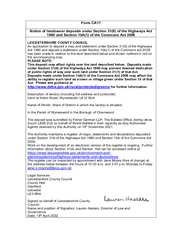 Form CA17 Notice of landowner deposits under Section 31(6) of the Highways Act 1980 and Section 15A(1) of the Commons Act 2006 LEICESTERSHIRE COUNTY COUNCIL An application to deposit a map and statement