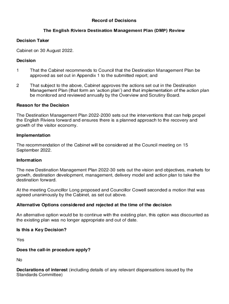 Record of Decisions The English Riviera Destination Management Plan (DMP) Review Decision Taker Cabinet on 30 August 2022. Decision 1That the Cabinet recommends to Council that the Destination Management