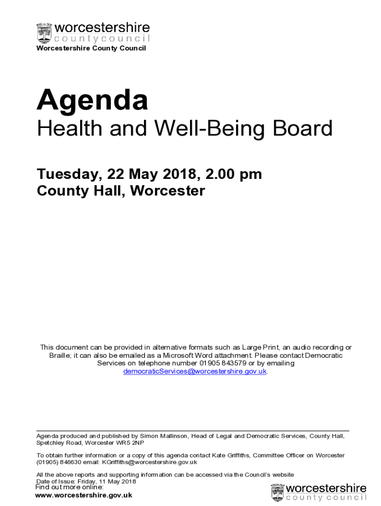 Worcestershire County CouncilAgenda Health and WellBeing Board Tuesday, 22 May 2018, 2.00 pm County Hall, Worcestershire document can be provided in alternative formats such as Large Print, an audio