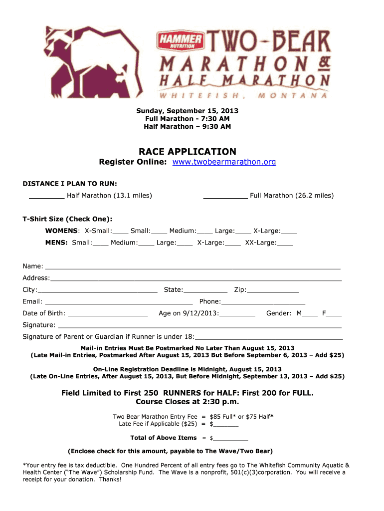 Get the free Two Bear Marathon Registration Form - twobearmarathon