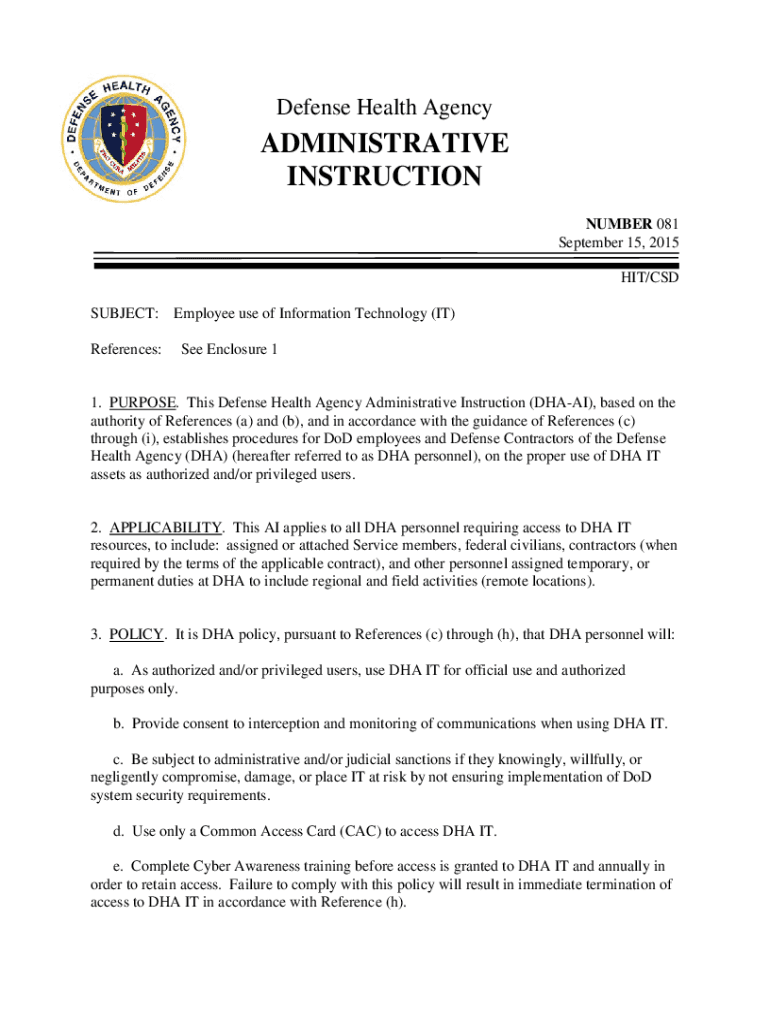 Defense Health AgencyADMINISTRATIVE INSTRUCTION NUMBER 081 September 15, 2015. HIT/CSD SUBJECT: References:Employee use of Information Technology (IT) See Enclosure 11. PURPOSE. This Defense Health