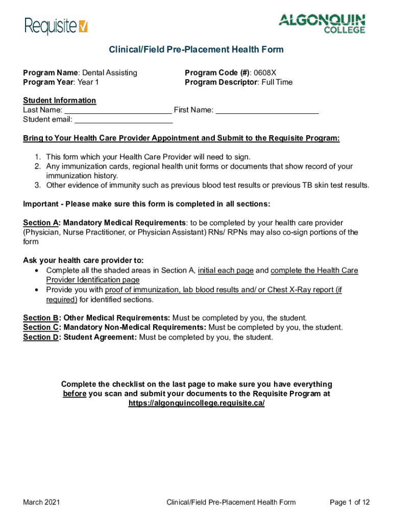 Clinical/Field Replacement Health Form Program Name: Dental Assisting Program Year: Year 1Program Code (#): 0608X Program Descriptor: Full TimeStudent Information Last Name: ___ First Name: ___ Student