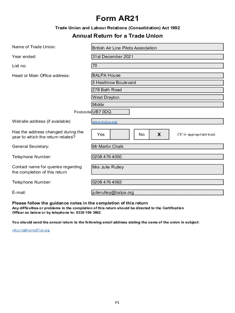 Name of Trade Union:British Air Line Pilots AssociationYear ended:31st December 2021List no:70Head
