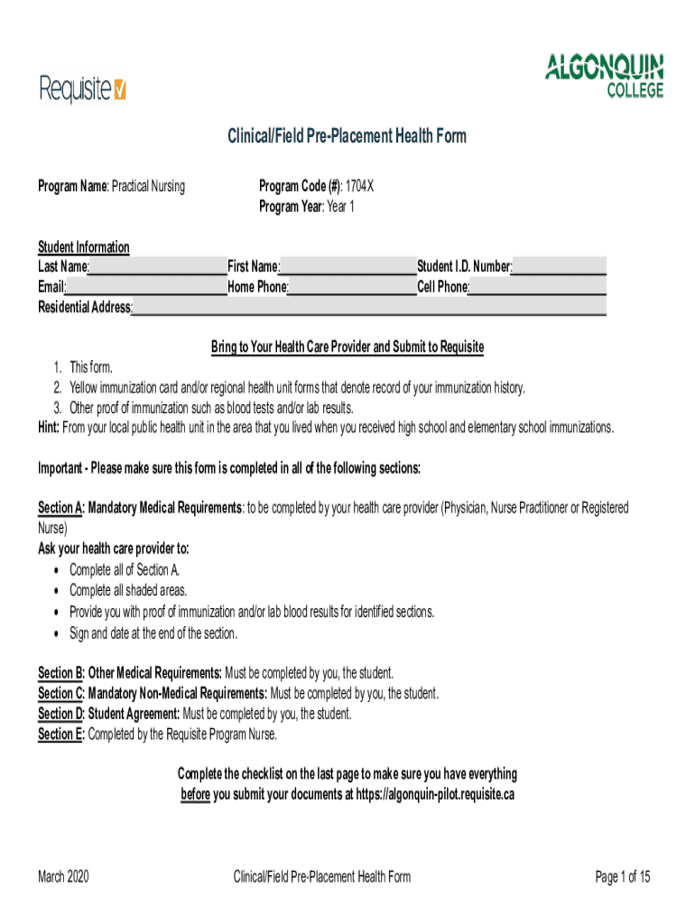Clinical/Field Replacement Health Form Program Name: Practical NursingStudent Information Last Name: Email: Residential Address:Program Code (#): 1704X Program Year: Year 1First Name: Home Phone:Student