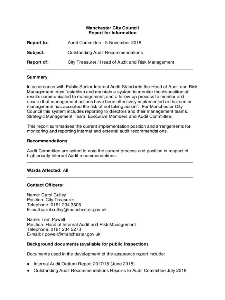 Manchester City Council Report for Information Report to:Audit Committee 5 November 2018Subject:Outstanding Audit RecommendationsReport of: City Treasurer / Head of Audit and Risk Management ___ Summary