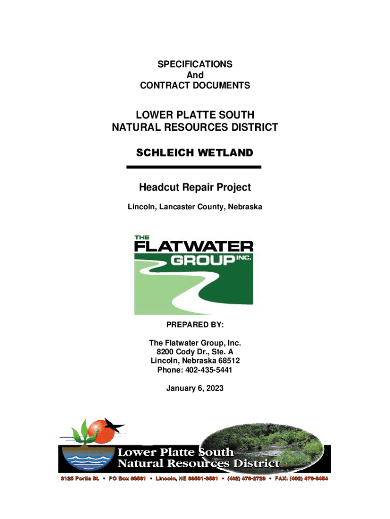 SPECIFICATIONS And CONTRACT DOCUMENTSLOWER PLATTE SOUTH NATURAL RESOURCES DISTRICT ICHEICH WETLAND Head cut Repair Project Lincoln, Lancaster County, NebraskaPREPARED BY: The Flat water Group, Inc.