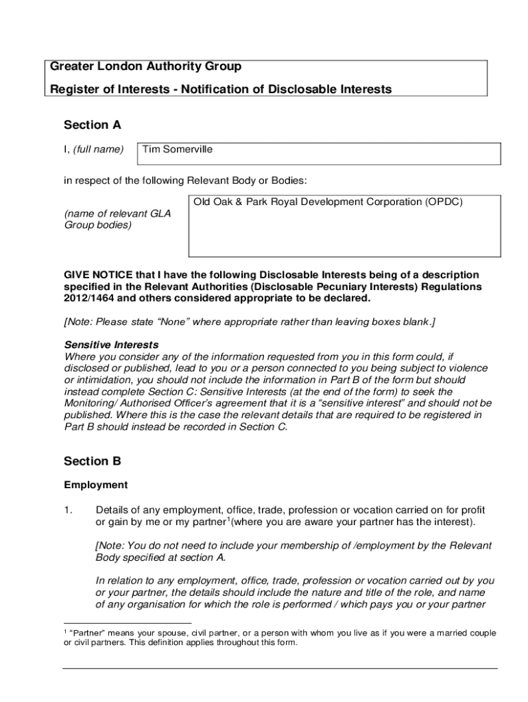 Greater London Authority Group Register of Interests Notification of Disclosable Interests Section A I, (full name)Tim Somerville respect of the following Relevant Body or Bodies: Old Oak & Park Royal
