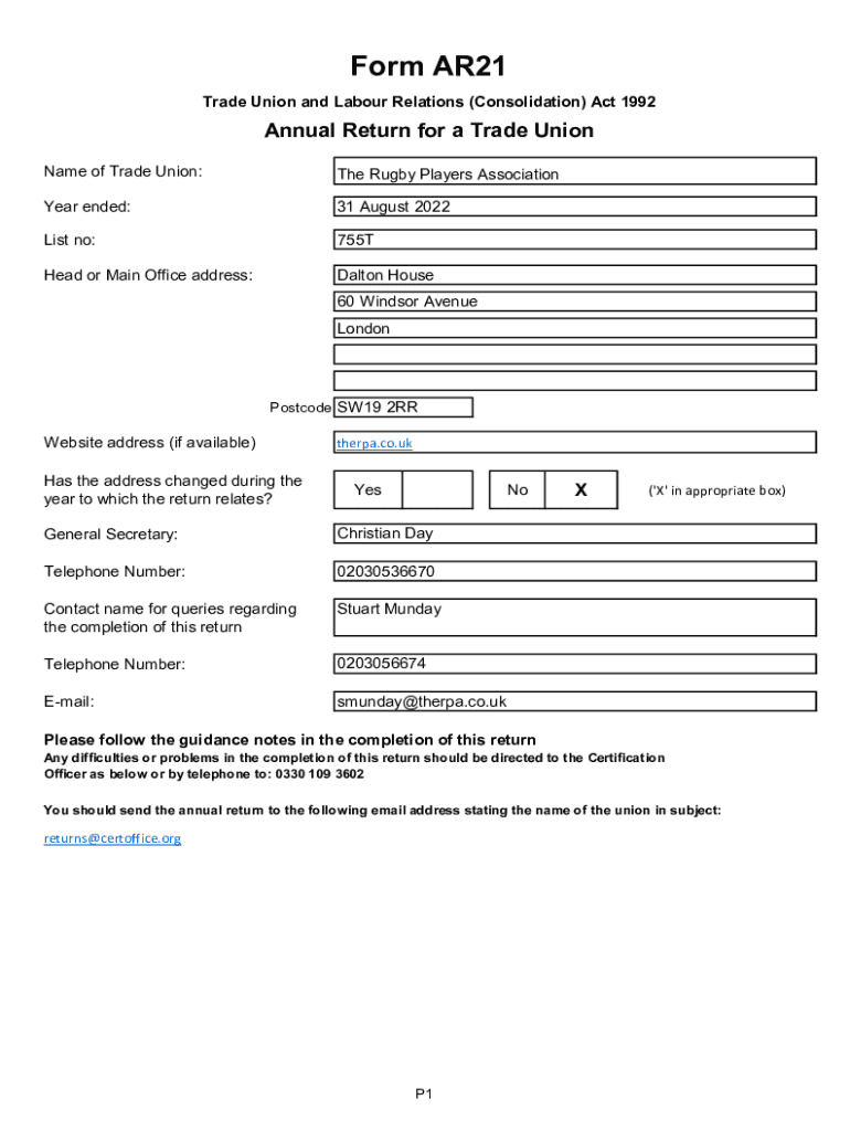 Form AR21 Trade Union and Labor Relations (Consolidation) Act 1992Annual Return for a Trade Union Name of Trade Union:The Rugby Players AssociationYear ended:31 August 2022List no:755THead or Main