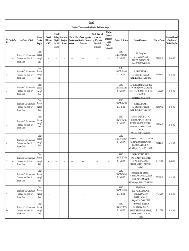 FormII Details of Contracts concluded during the Month August 23Sl. Tender No. No.Item/ Nature of WorkMode of Tender EnquiryPurchase of LED Luminaries, Tools and Misc. Items for Power HouseDirect
