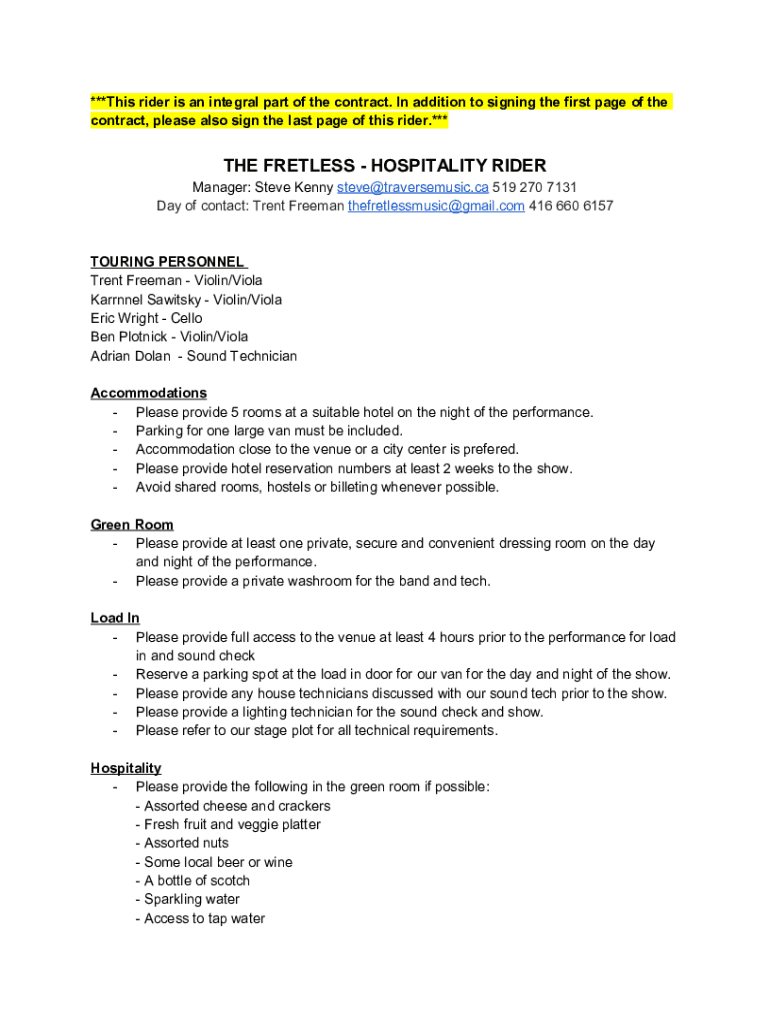 ***This rider is an integral part of the contract. In addition to signing the first page of the contract, please also sign the last page of this rider.***THE FRUITLESS HOSPITALITY RIDER Manager: Steve