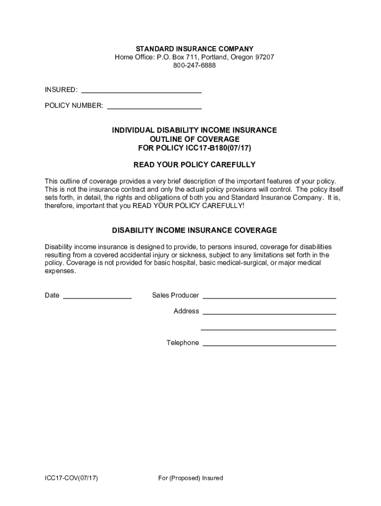 Reset STANDARD INSURANCE COMPANY Home Office: P.O. Box 711, Portland, Oregon 97207 8002476888 INSURED: POLICY NUMBER:INDIVIDUAL DISABILITY INCOME INSURANCE OUTLINE OF COVERAGE FOR POLICY ICC17B180(07/17)